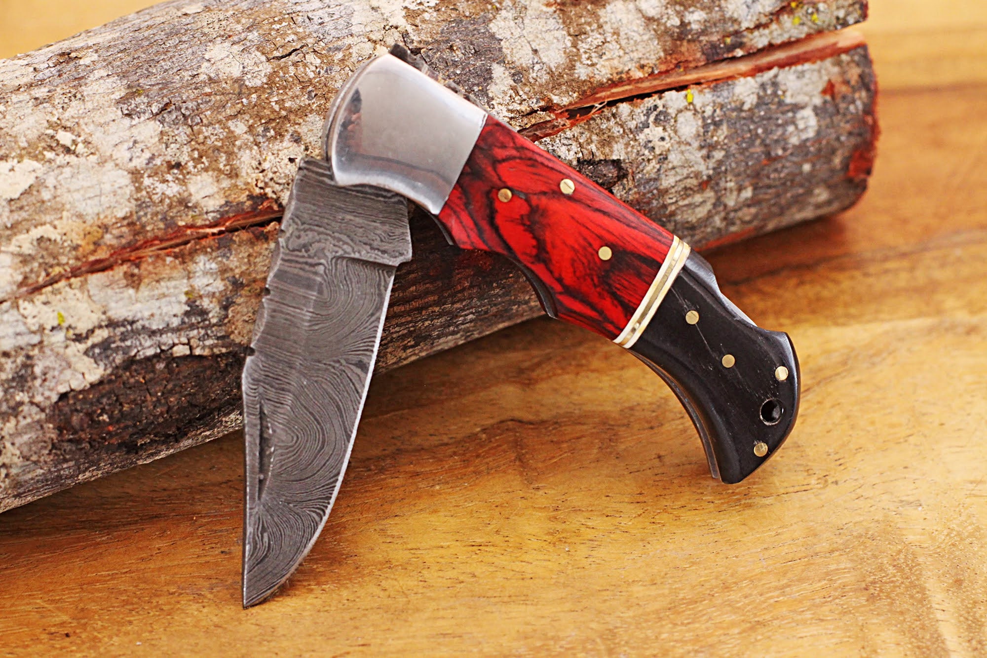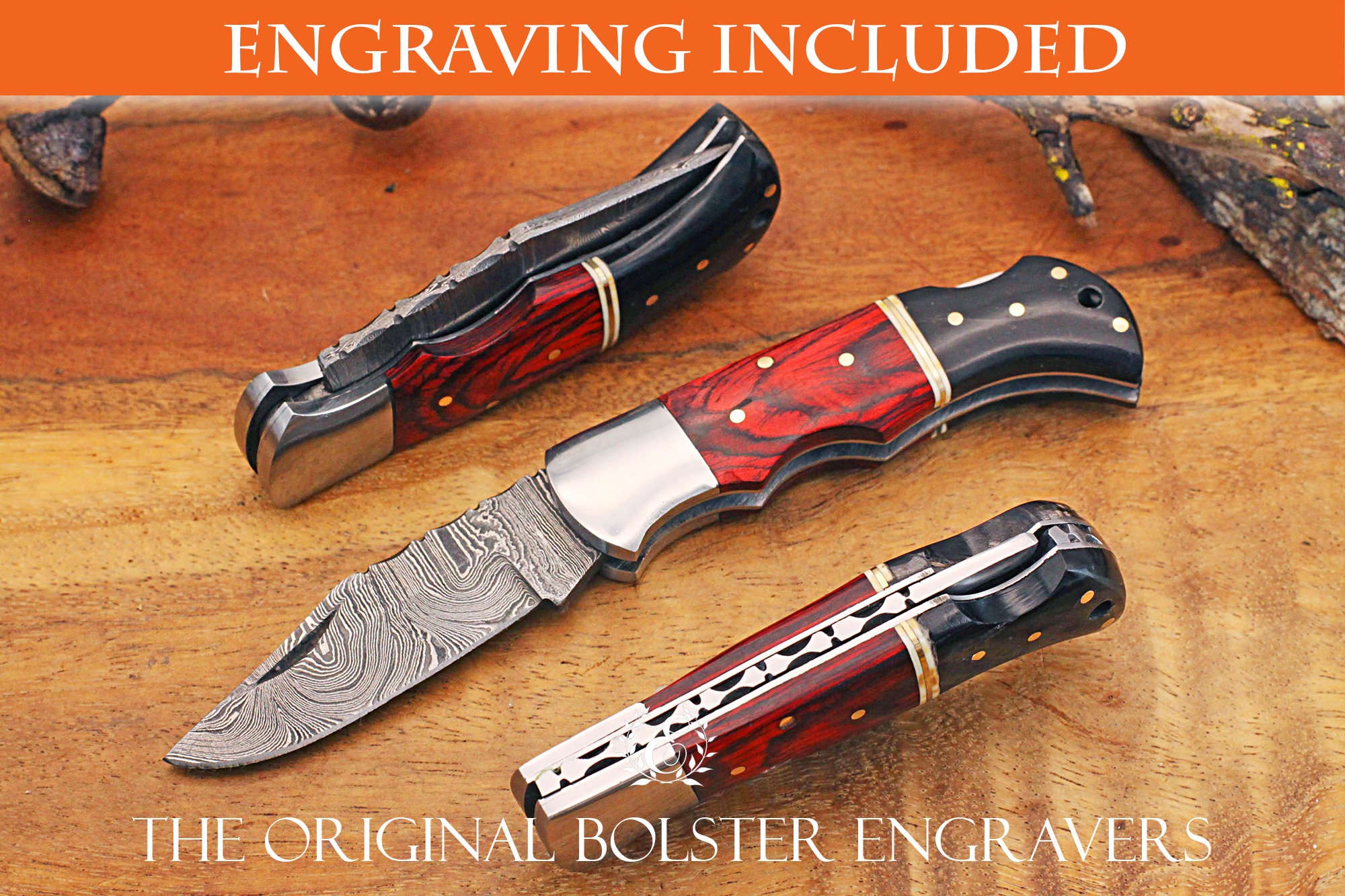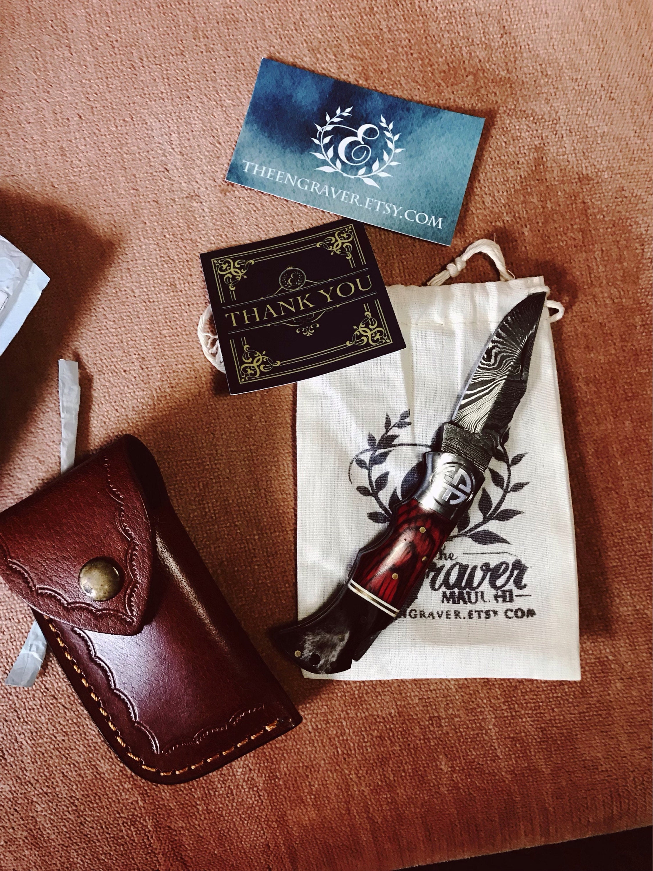 •  Please note that we offer only front side engraving and limited monograms for this affordable Damascus pocket folding knife. Knife and leather sheath is made in Pakistan and engraved in our Maui workshop.