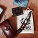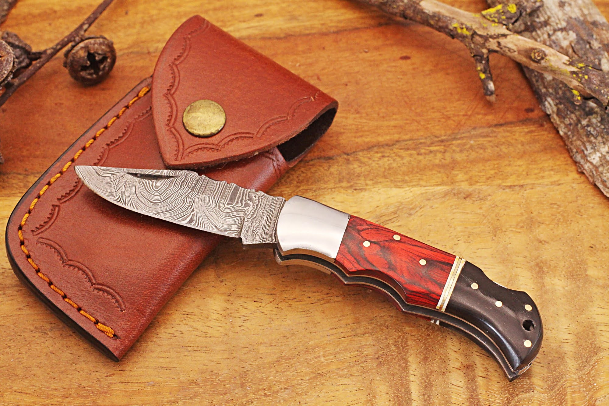 Damascus Pocket Folding Knife with Leather Sheath and the Engraver gift bag.
