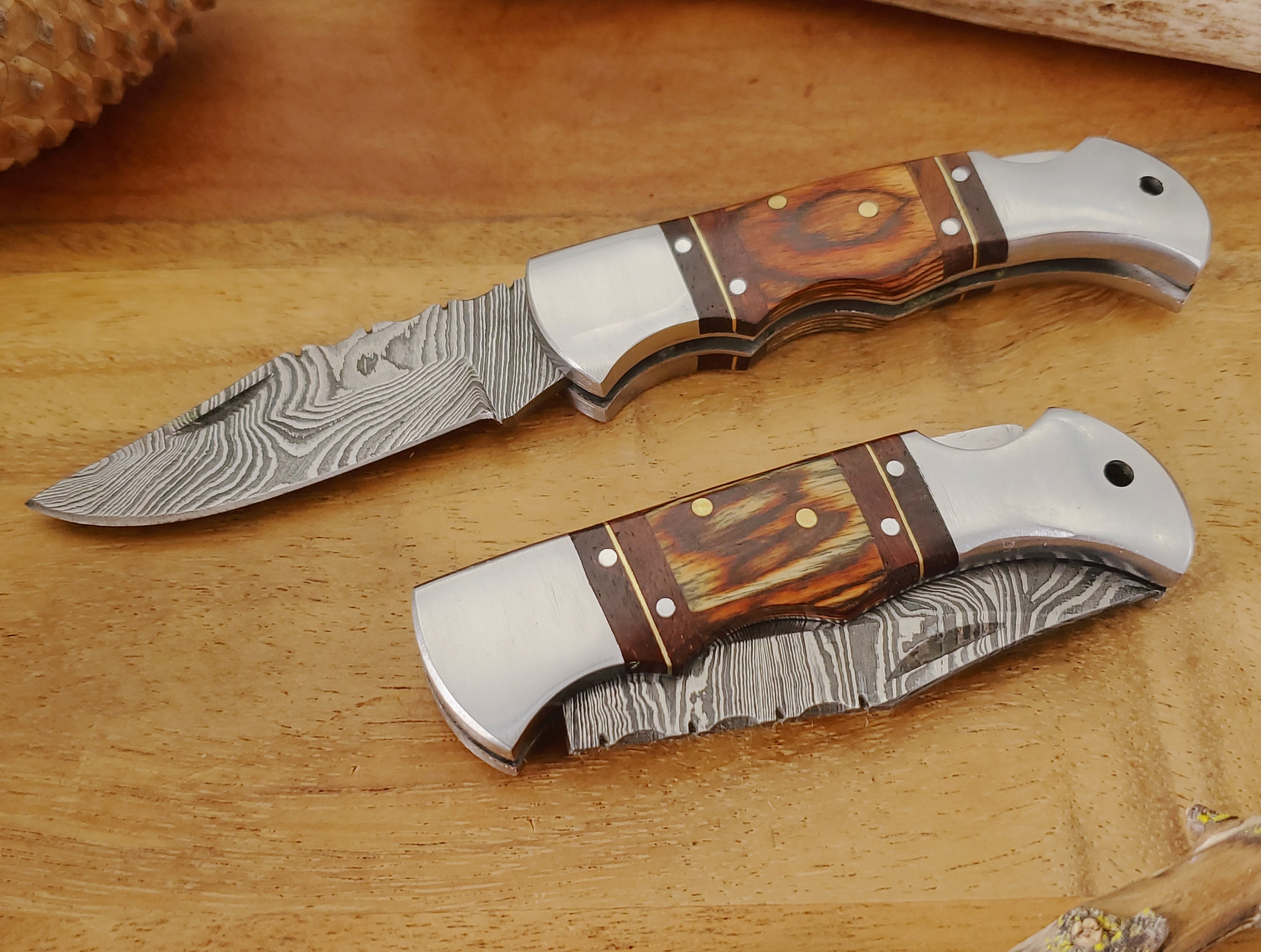 •  Please note that we offer only front side engraving and limited monograms for this affordable Damascus pocket folding knife. Knife and leather sheath is made in Pakistan and engraved in our Maui workshop.