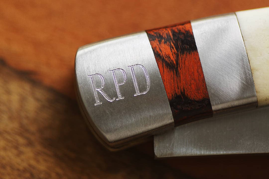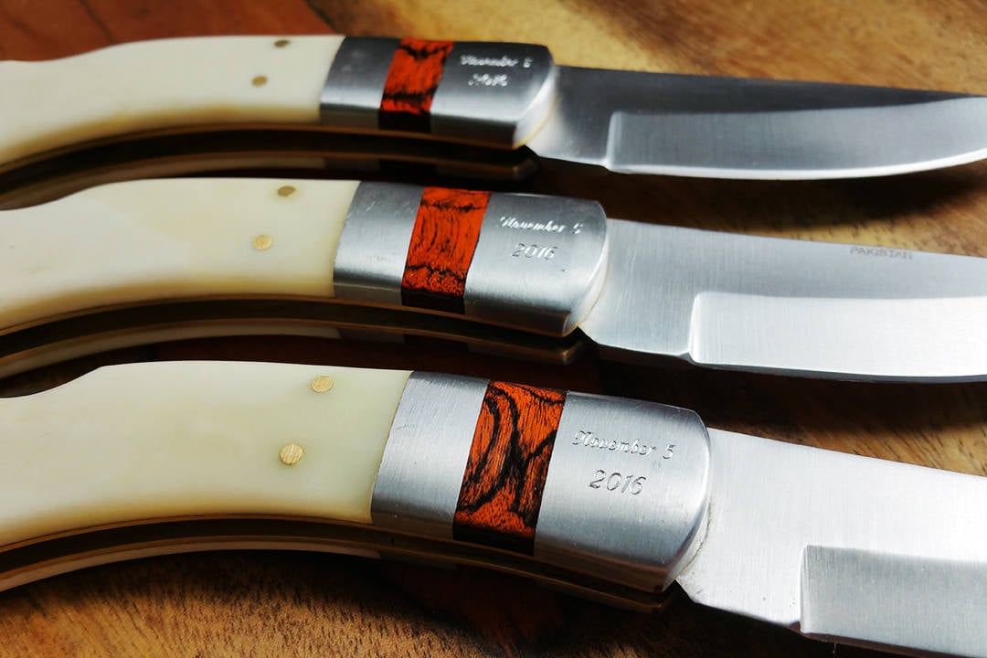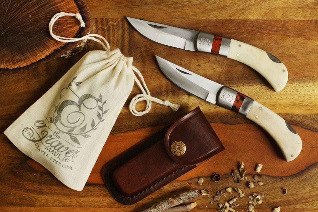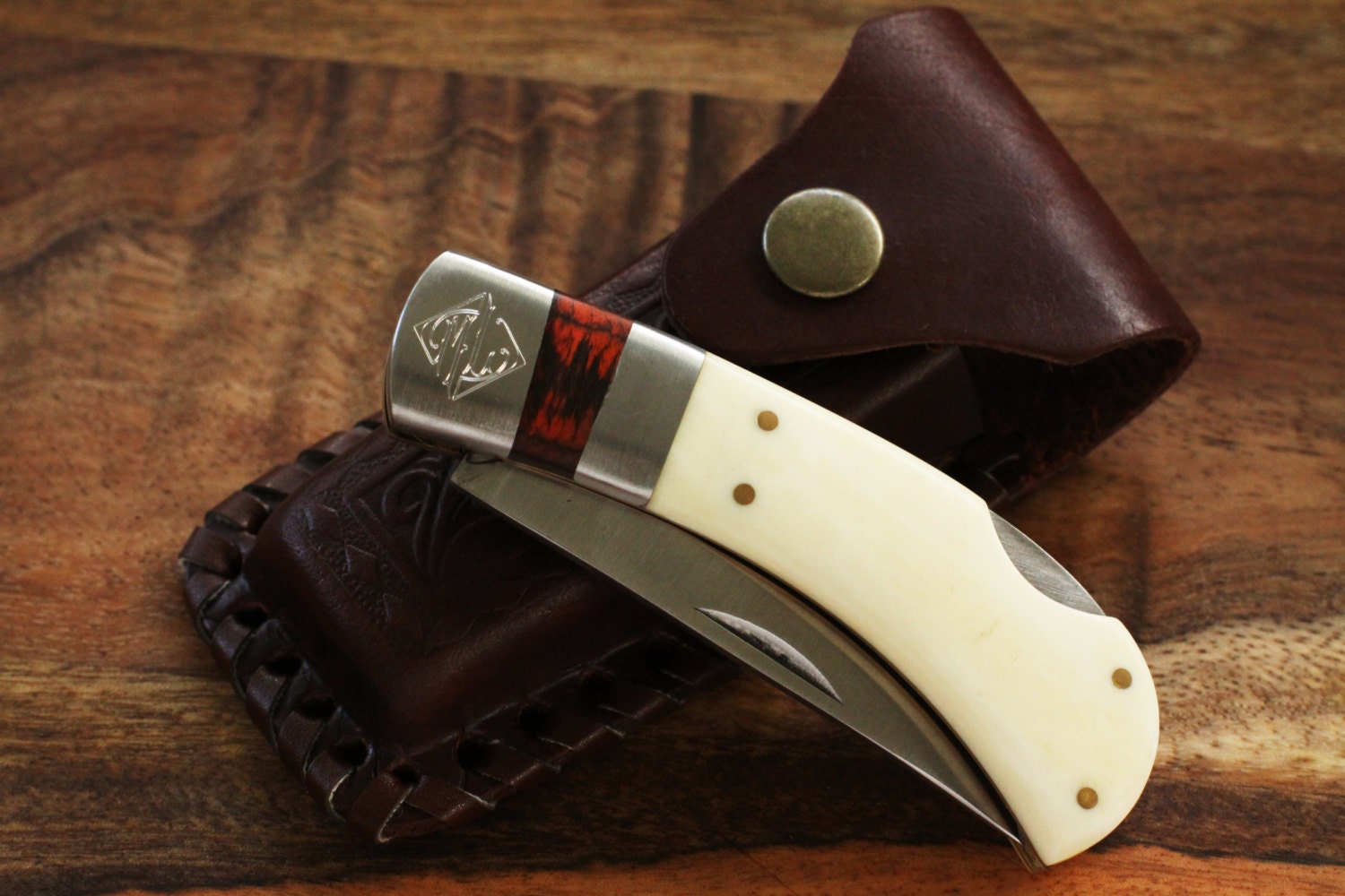 Beautiful and sleek, this single bolster lock back knife is engraved with any custom monogram. Crafted in white bone and stainless steel with a wood inlay accent & comes with a imprinted leather sheath. This personalized engraved pocket knife is perfect gift idea!