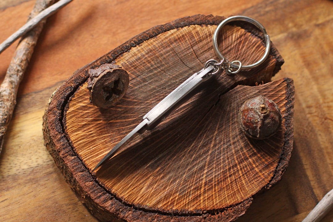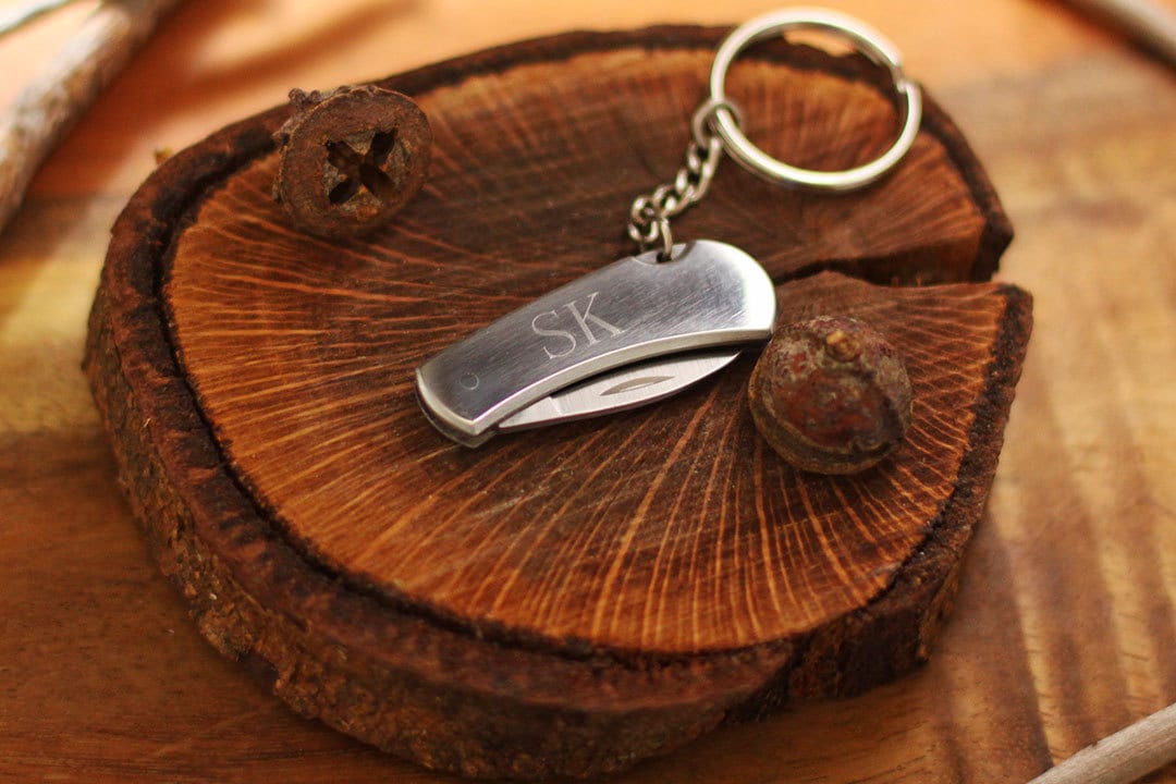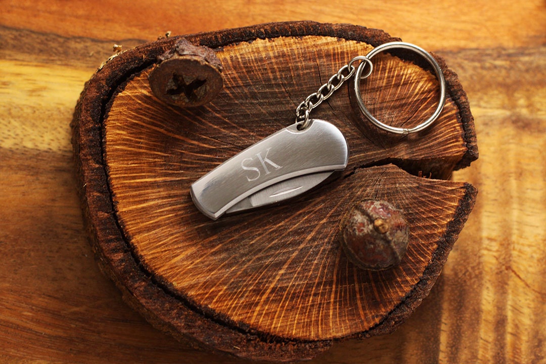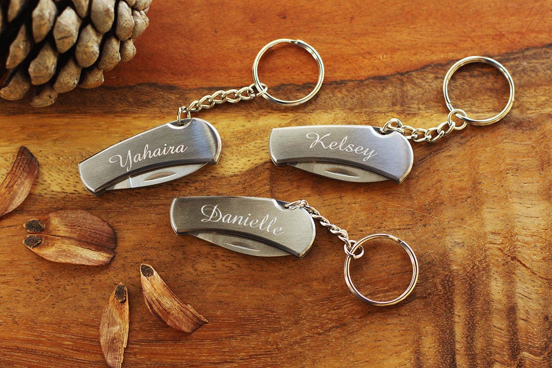 Small personalized bridesmaid keychain knife constructed of solid stainless steel. The perfect personalized gift for your bridesmaids!