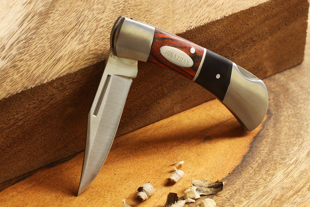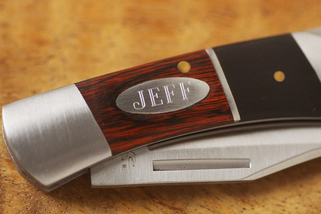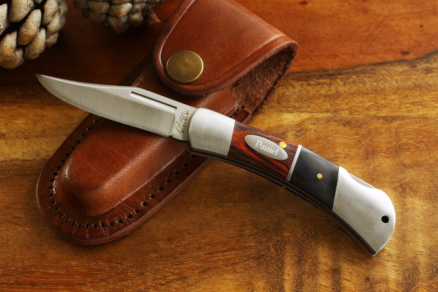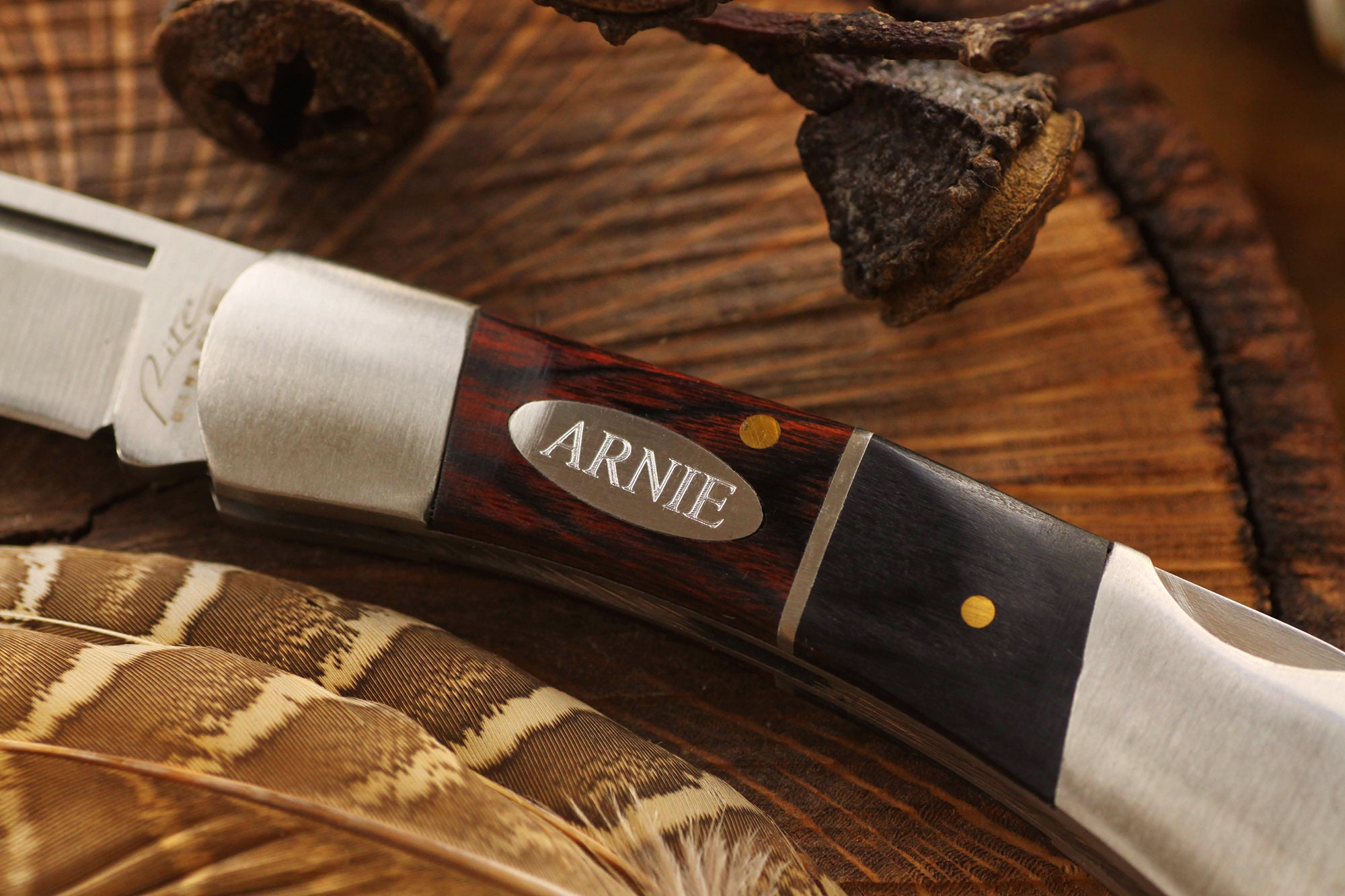 Custom engraved lock back pocket knife crafted in dark and light wood inlay and stainless steel.