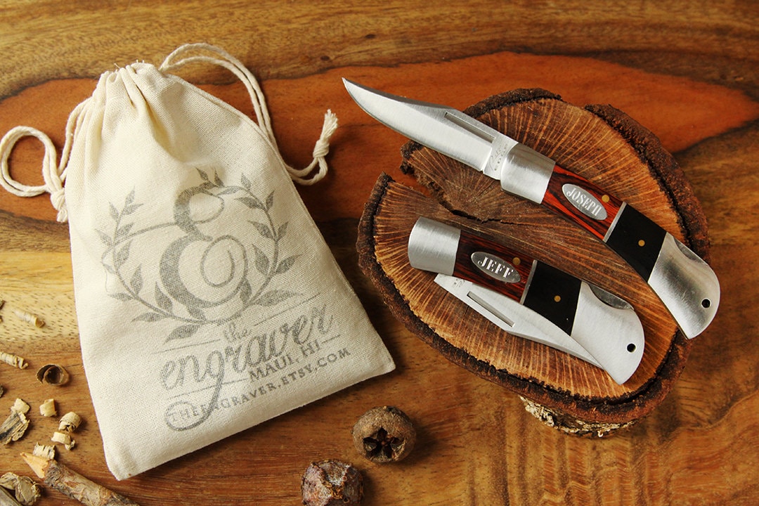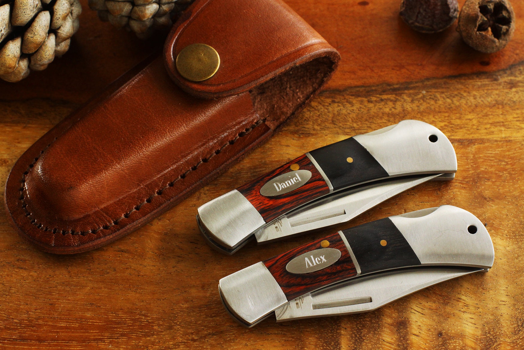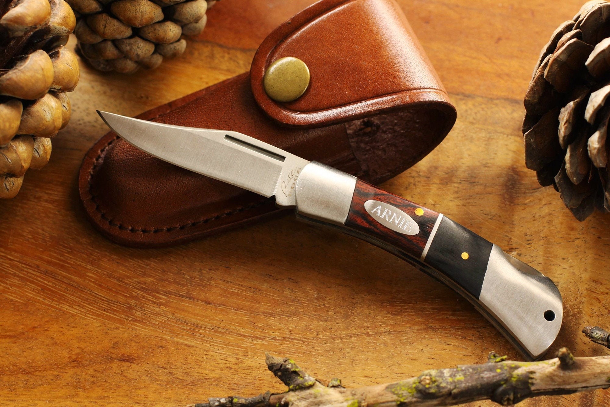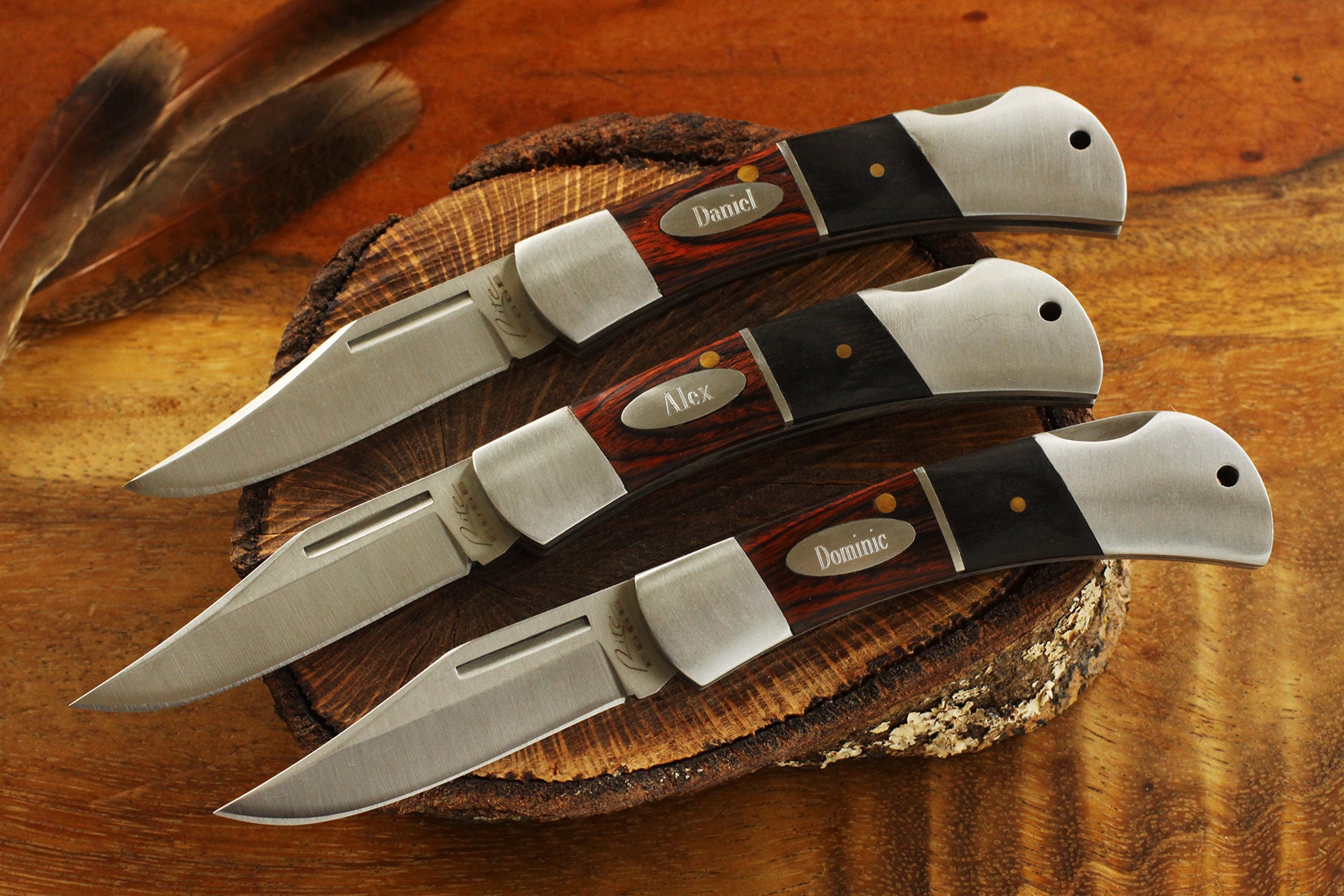 Custom engraved lock back pocket knife crafted in dark and light wood inlay and stainless steel.