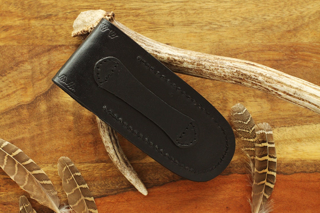 Black Leather Sheath with belt hook for folding knives. This black leather pouch with belt loop for large pocket knife is a perfect gift idea.