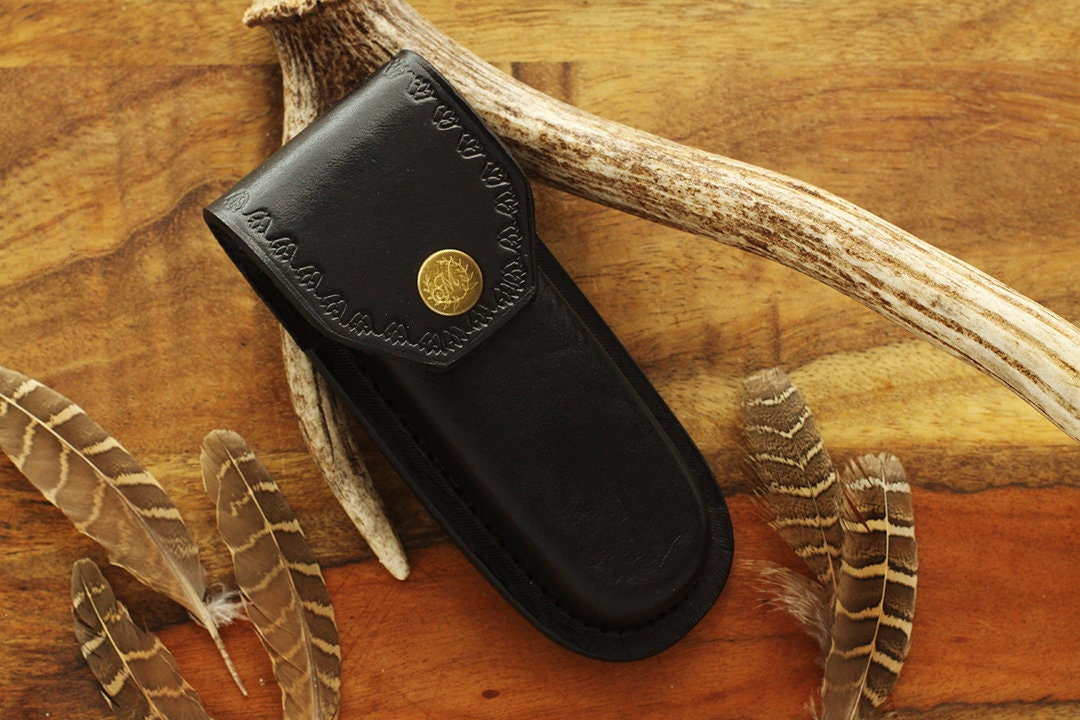 This pocket knife sheath is made from leather and will fit knife size from 5 inch from our store on ETSY. The button is engraved with your custom initial.