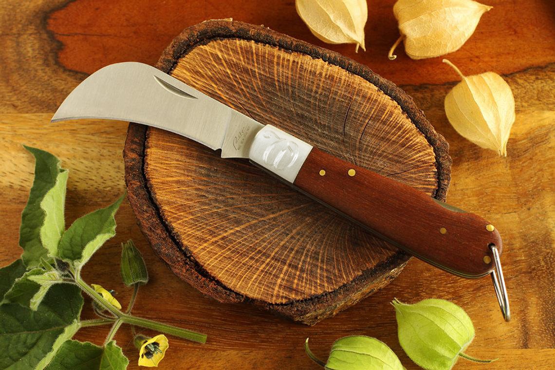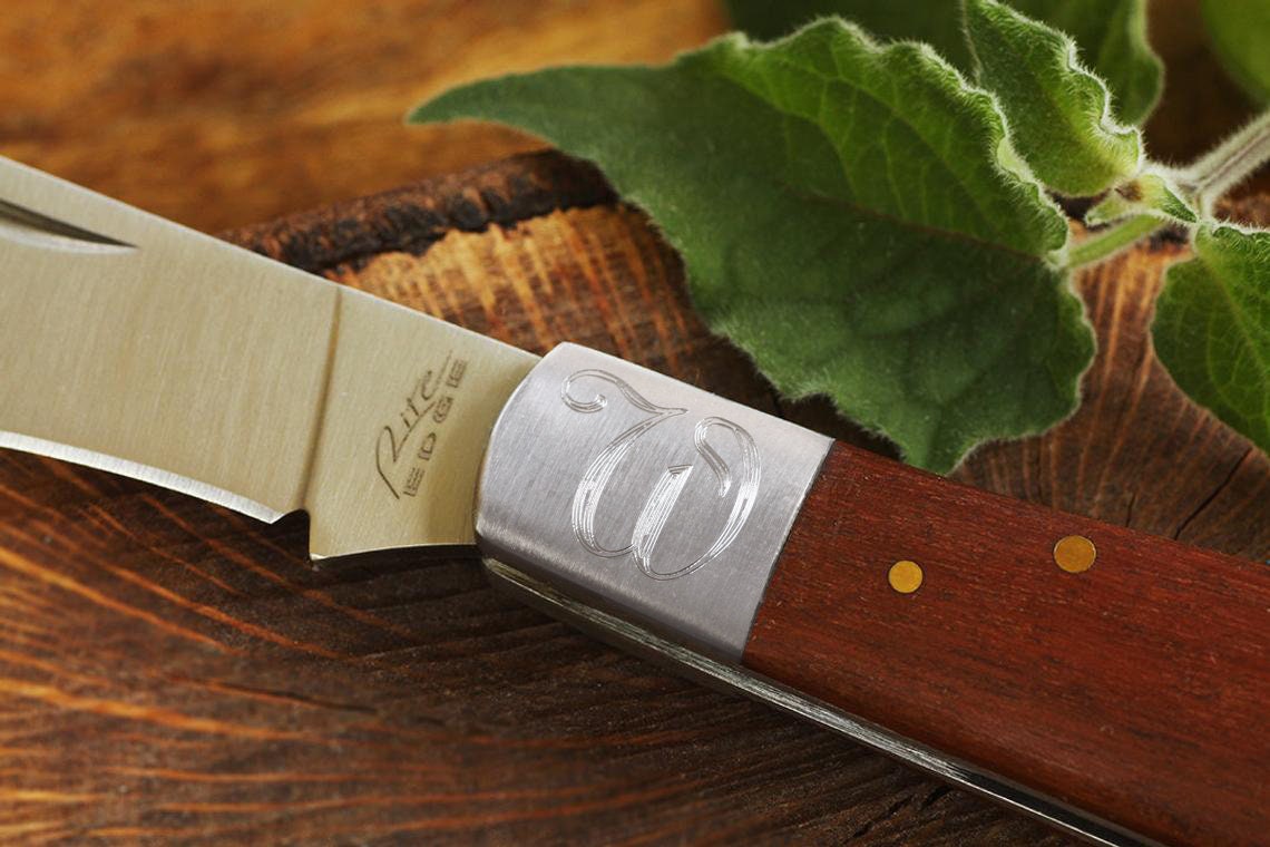 Celebrate Spring with a gift to remember! This hawkbill pruning folding knife is perfect for that dedicated gardener in your life.  Crafted with a wood handle. Please note this knife is available in SINGLE LETTER engraving only.