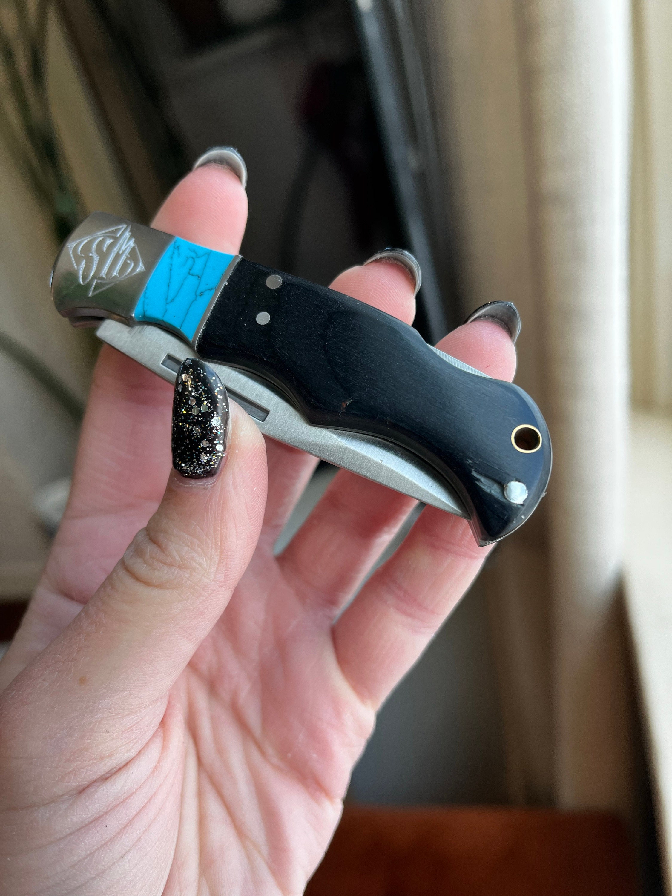 Inlaid with faux turquoise with a black wood bolster, this high quality knife is engraved with any custom monogram.