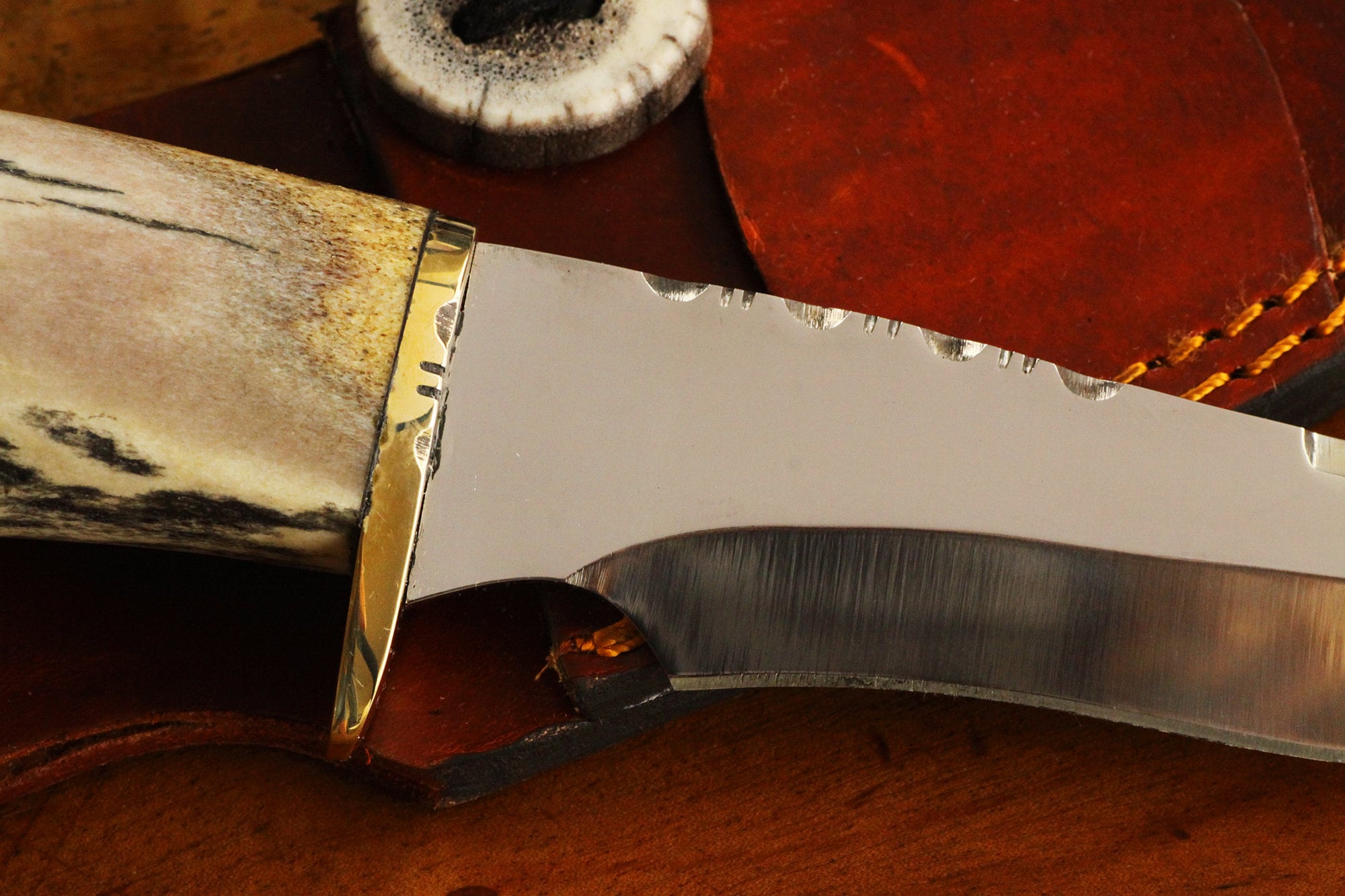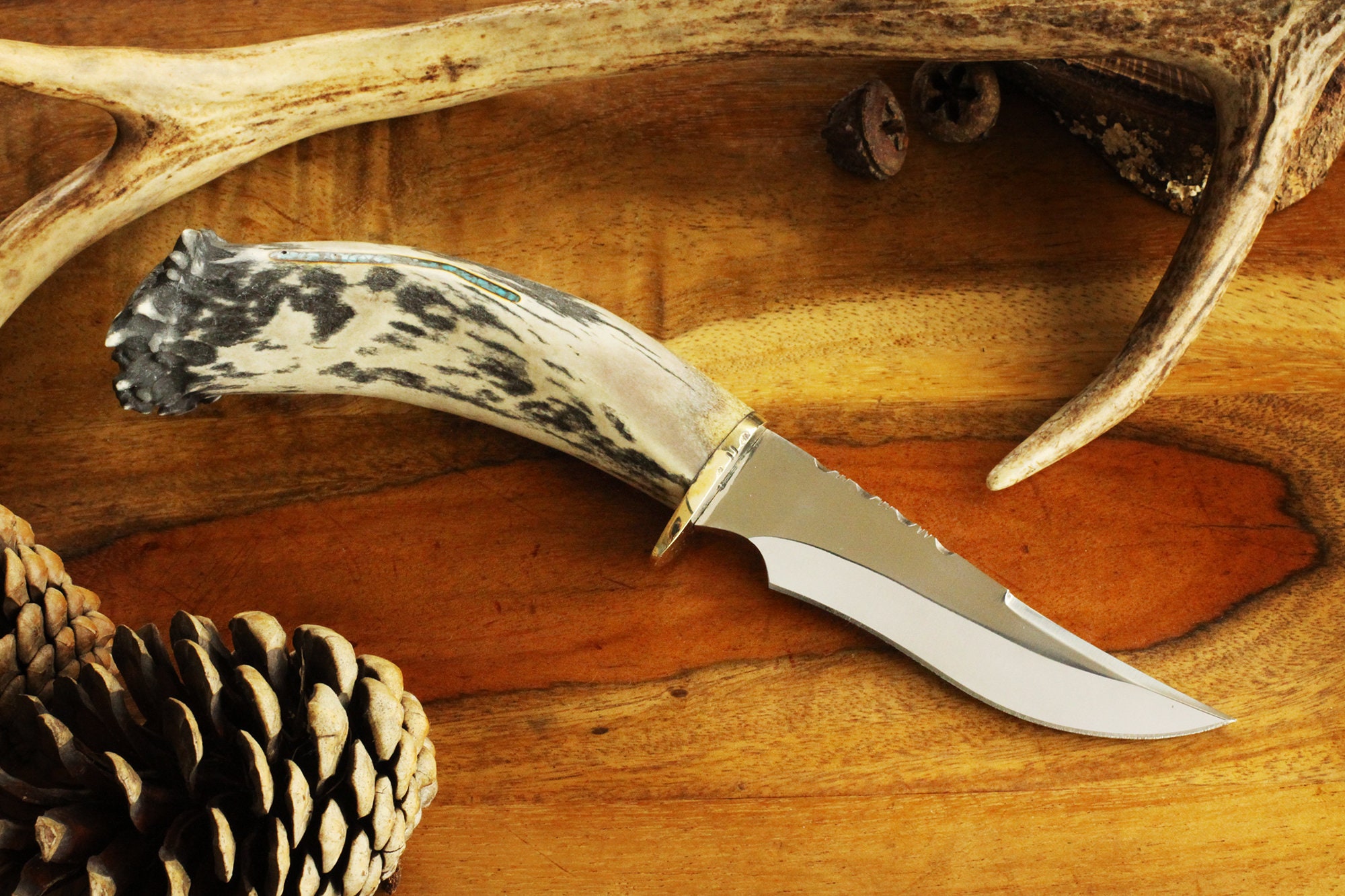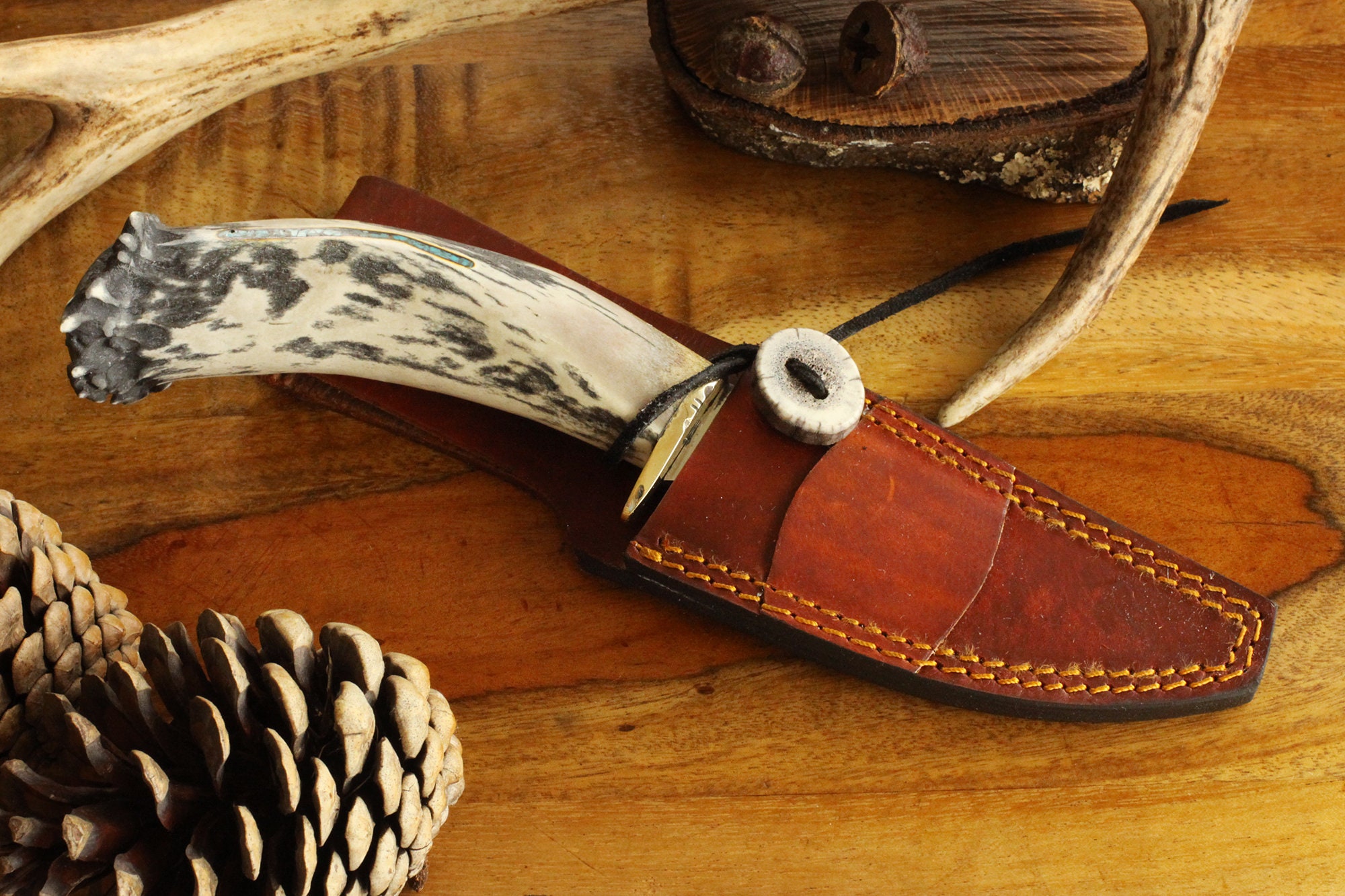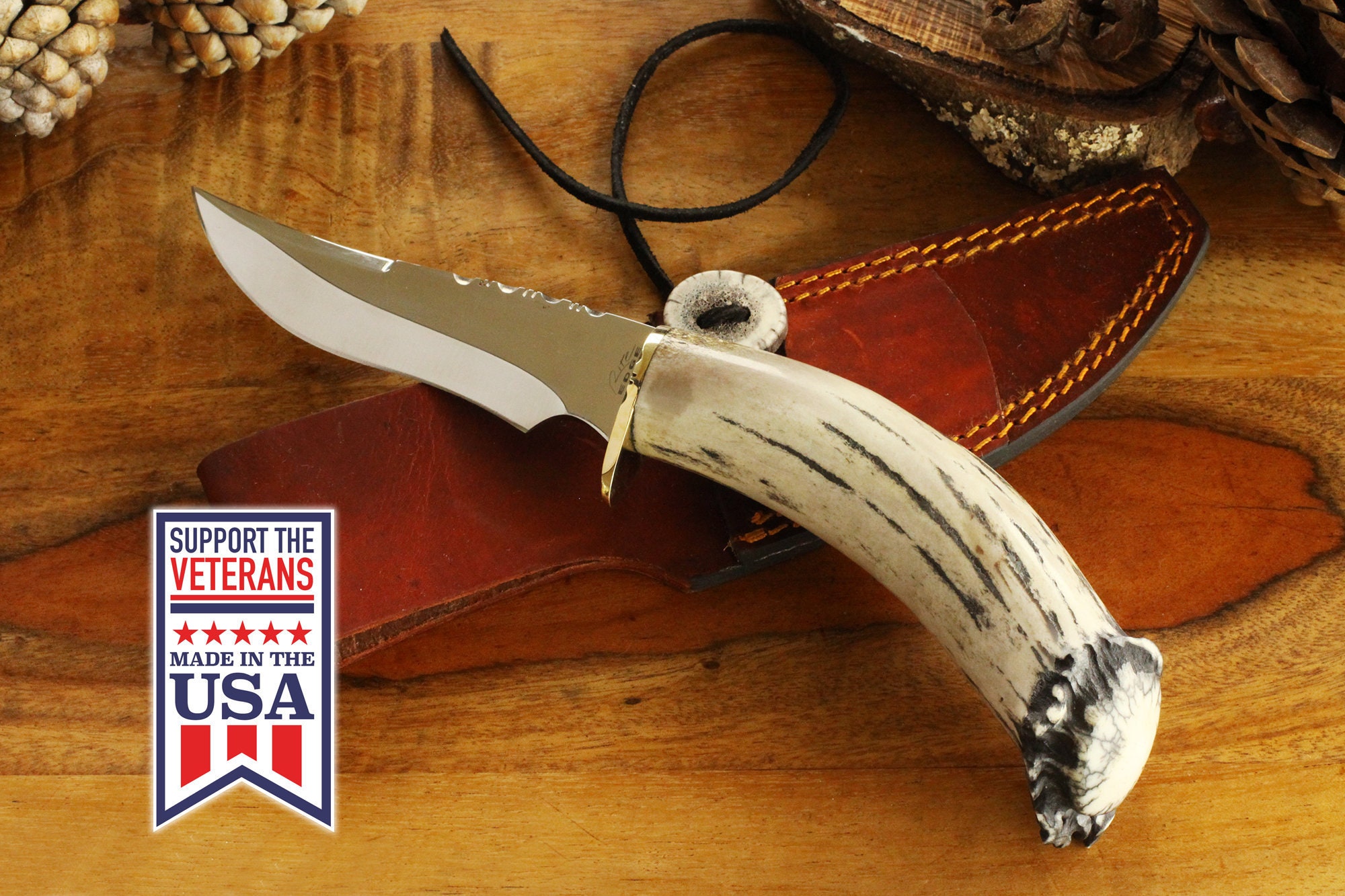 Experience the rugged quality of a truly USA made knife. This unique piece is a deer antler knife, crafted with a genuine stag antler handle that makes every knife one-of-a-kind.