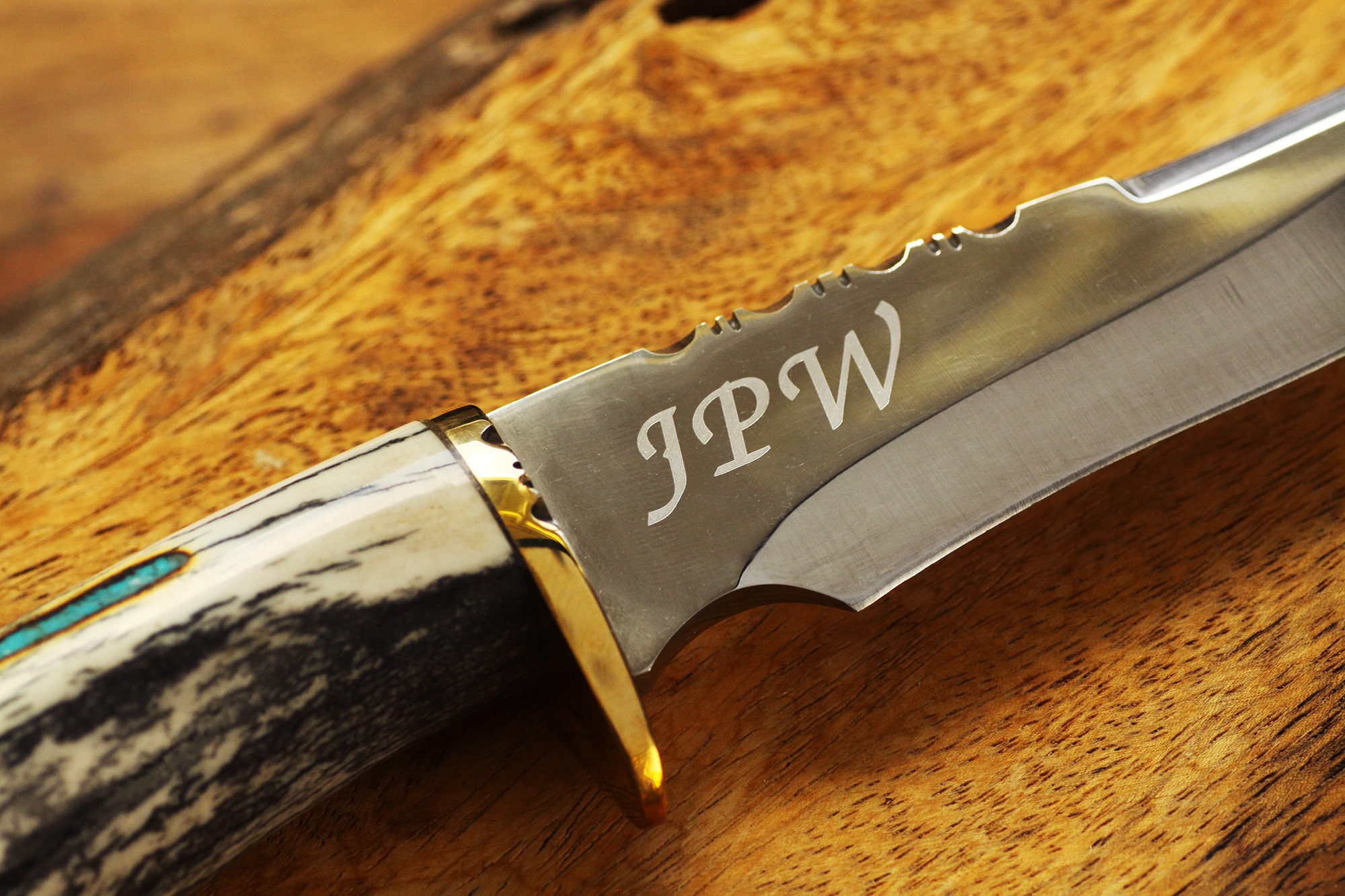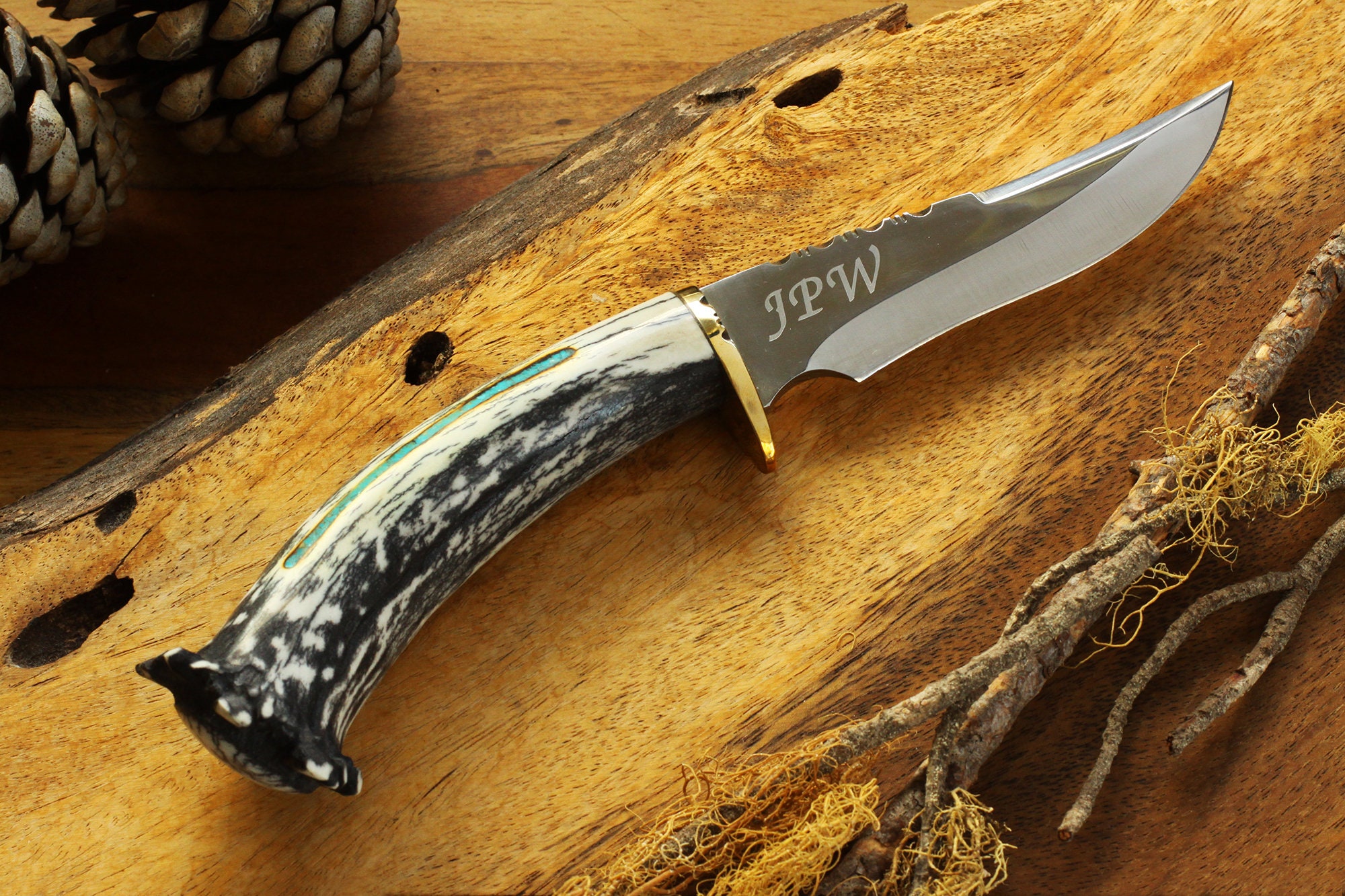Veteran made in the USA, this beautiful hunting knife will be a cherished heirloom for generations. Inlaid with Genuine Kingman turquoise and comes with a handsome leather sheath. Engraved on the blade with up to 12 characters.